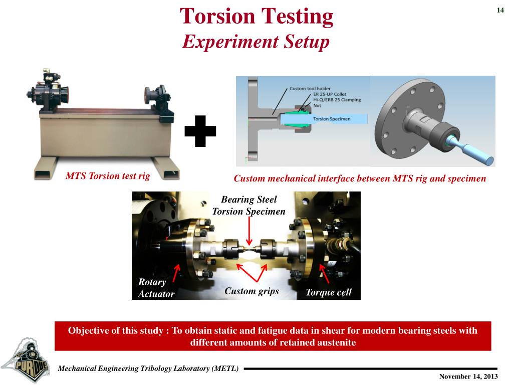 Torsion TestingExperiment Setup MTS Torsion test rig Custom mechanical interface between MTS rig and specimen Bearing Steel Torsion Specimen Rotary Actuator Custom grips Torque cell Objective of this study : To obtain static and fatigue data in shear for modern bearing steels with different amounts of retained austenite