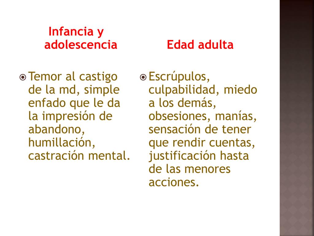 Infancia y adolescencia • Temor al castigo de la md, simple enfado que le da la impresión de abandono, humillación, castración mental. Edad adulta • Escrúpulos, culpabilidad, miedo a los demás, obsesiones, manías, sensación de tener que rendir cuentas, justificación hasta de las menores acciones.