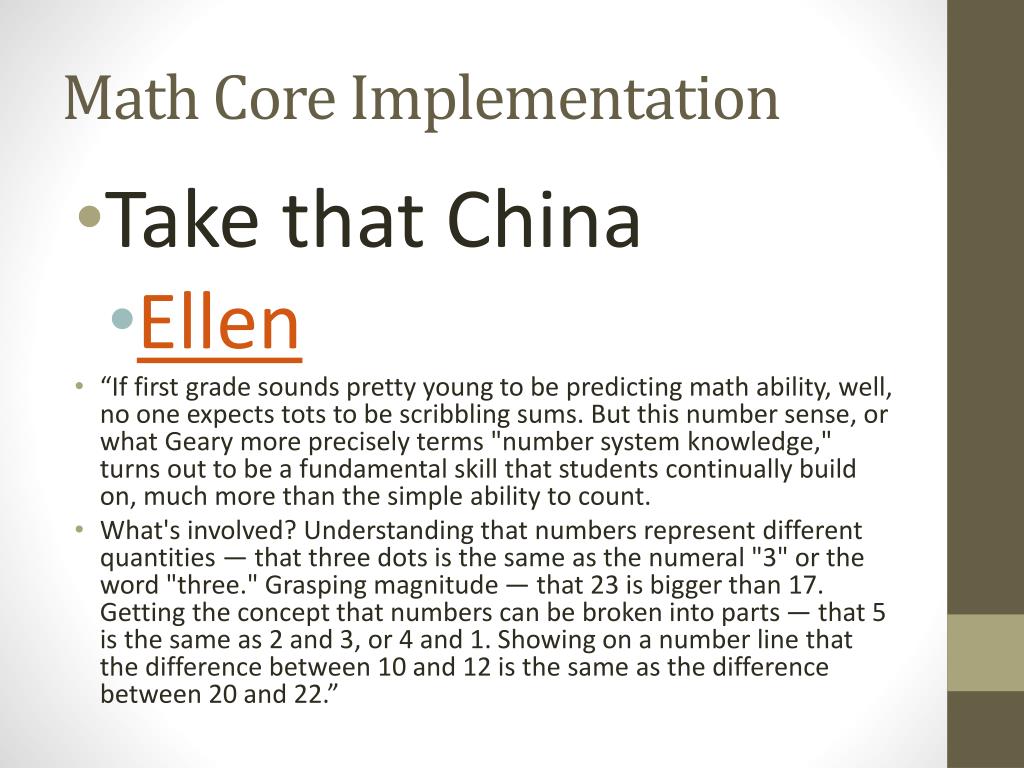 Math Core Implementation • Take that China • Ellen • “If first grade sounds pretty young to be predicting math ability, well, no one expects tots to be scribbling sums. But this number sense, or what Geary more precisely terms "number system knowledge," turns out to be a fundamental skill that students continually build on, much more than the simple ability to count. • What's involved? Understanding that numbers represent different quantities — that three dots is the same as the numeral "3" or the word "three." Grasping magnitude — that 23 is bigger than 17. Getting the concept that numbers can be broken into parts — that 5 is the same as 2 and 3, or 4 and 1. Showing on a number line that the difference between 10 and 12 is the same as the difference between 20 and 22.”