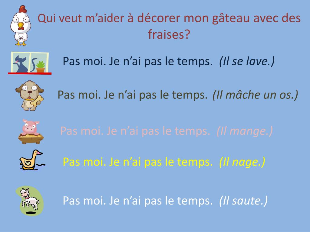 Qui veut m’aider à décorer mon gâteau avec des fraises? Pas moi. Je n’ai pas le temps. (Il se lave.) Pas moi. Je n’ai pas le temps. (Il mâche un os.) Pas moi. Je n’ai pas le temps. (Il mange.) Pas moi. Je n’ai pas le temps. (Il nage.) Pas moi. Je n’ai pas le temps. (Il saute.)