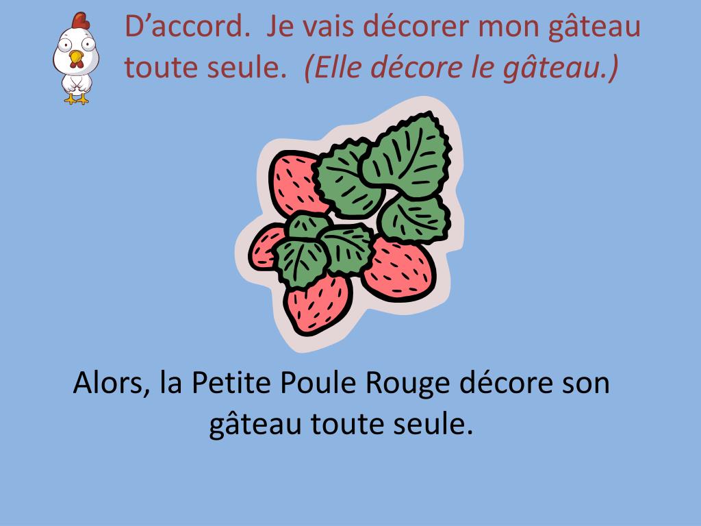 D’accord. Je vais décorer mon gâteau toute seule. (Elle décore le gâteau.) Alors, la Petite Poule Rouge décore son gâteau toute seule.