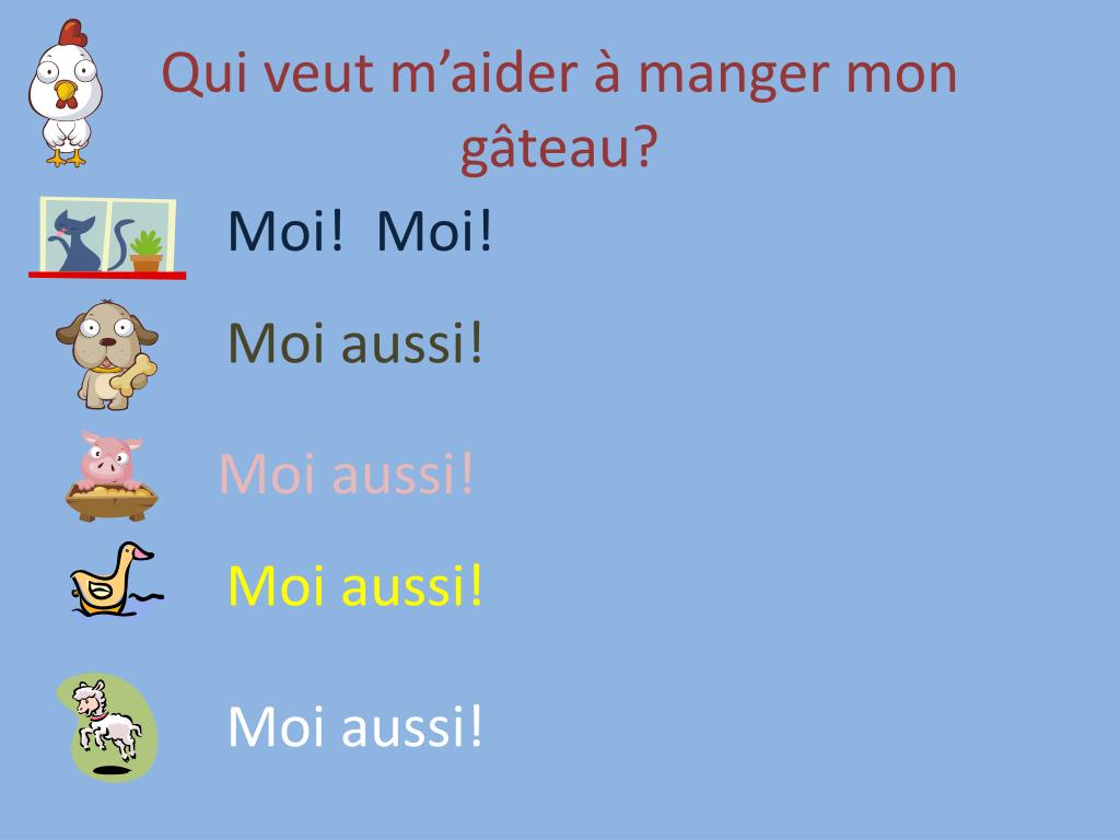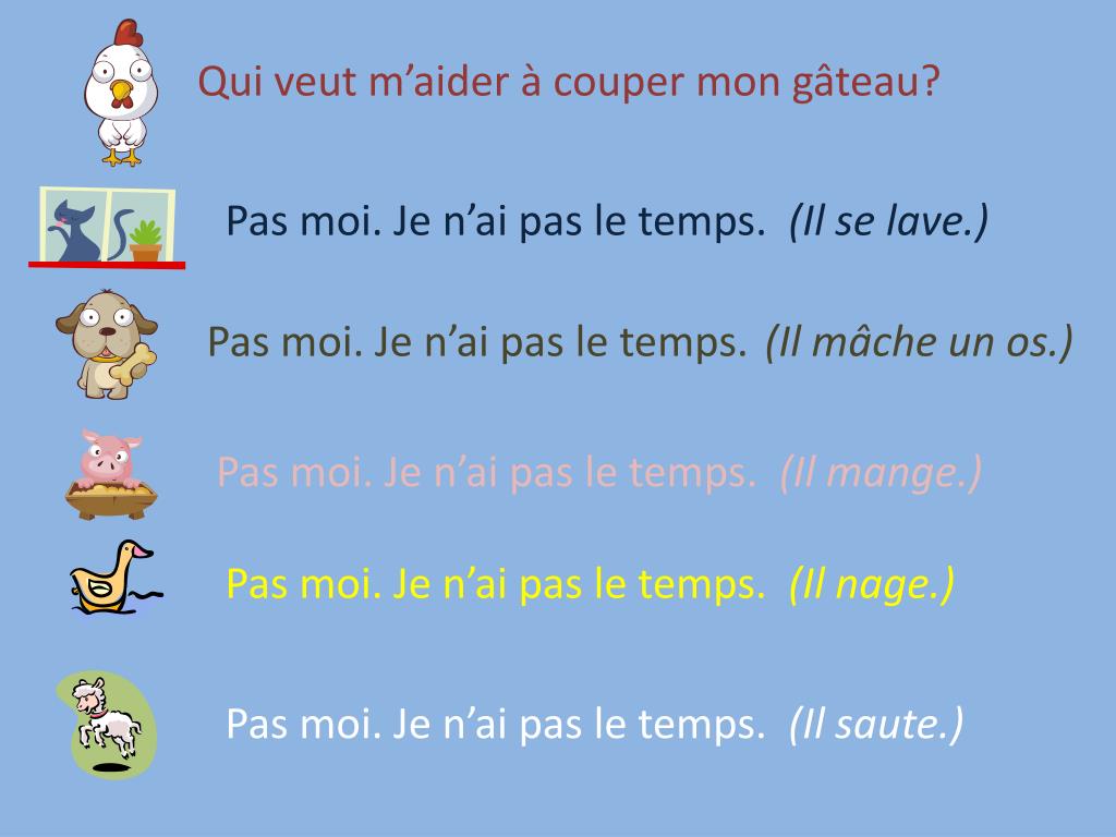 Qui veut m’aider à couper mon gâteau? Pas moi. Je n’ai pas le temps. (Il se lave.) Pas moi. Je n’ai pas le temps. (Il mâche un os.) Pas moi. Je n’ai pas le temps. (Il mange.) Pas moi. Je n’ai pas le temps. (Il nage.) Pas moi. Je n’ai pas le temps. (Il saute.)