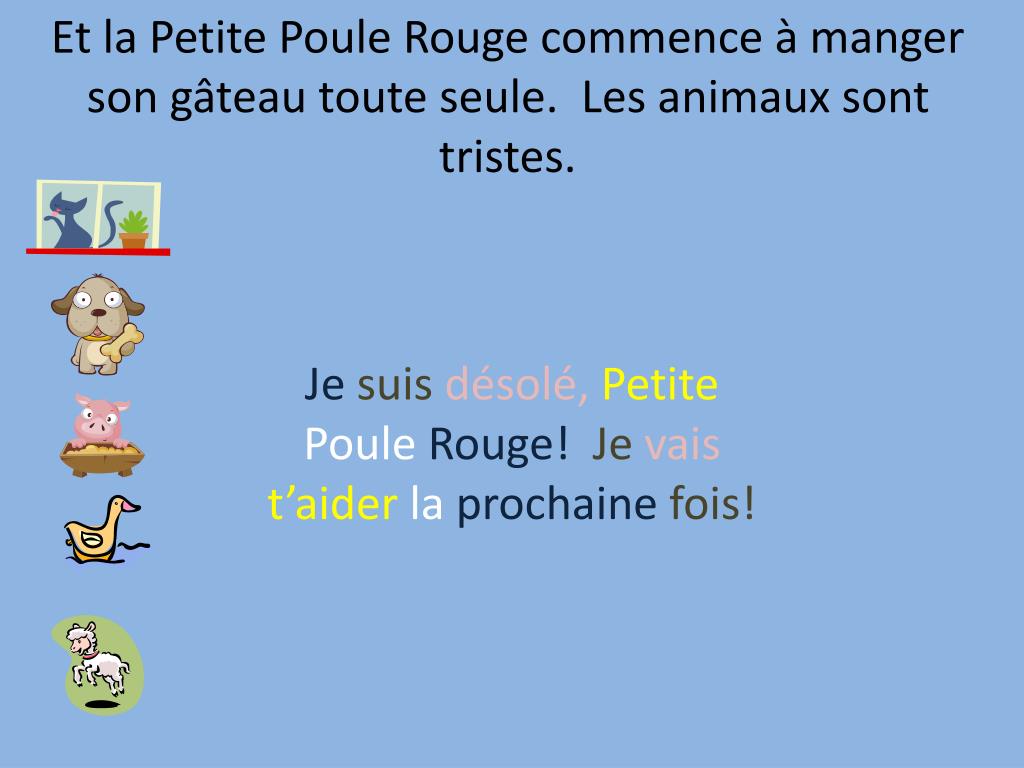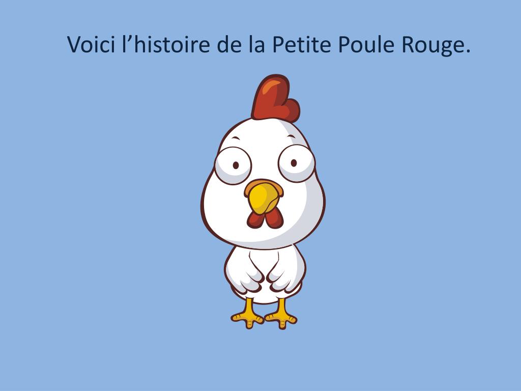 La Petite Poule Rouge. Voici l’histoire de la Petite Poule Rouge. Elle habite dans une maison de bois dans la forêt. Voici ses amis. Le chat noir aime se laver. Le chien brun aime mâcher des os. Le cochon rose aime manger beaucoup. Le canard jaune aime nager.