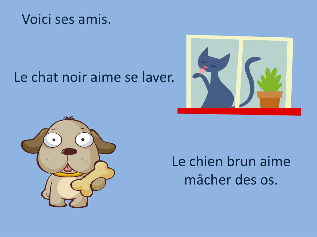 Voici ses amis. Le chat noir aime se laver. Le chien brun aime mâcher des os.