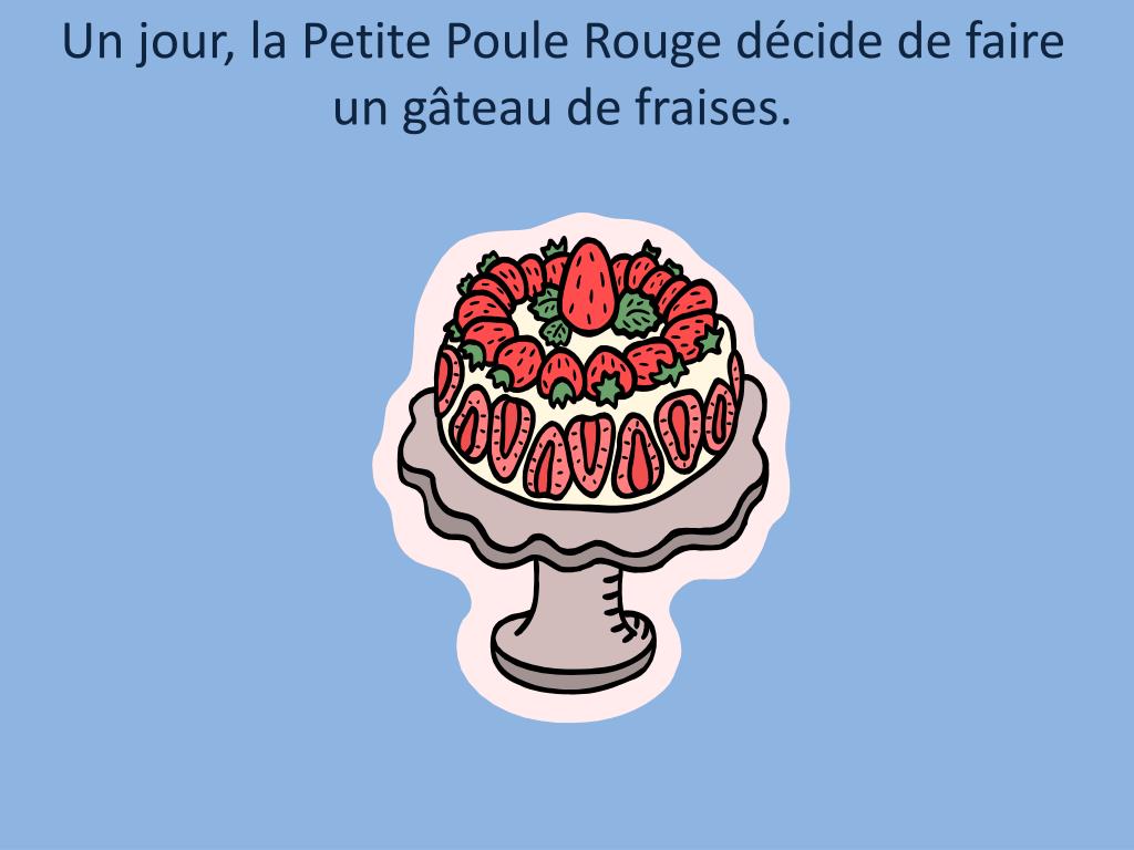 Un jour, la Petite Poule Rouge décide de faire un gâteau de fraises.