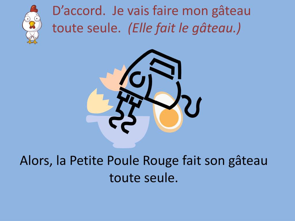 D’accord. Je vais faire mon gâteau toute seule. (Elle fait le gâteau.) Alors, la Petite Poule Rouge fait son gâteau toute seule.