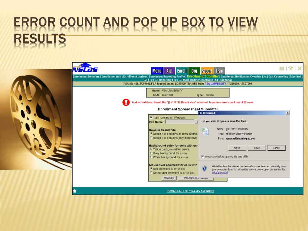 New Enrollment Reporting File Format • Enhanced Fixed Width flat file • Enhanced Comma Separated Values (CSV) file • Enhanced eXtensible Markup Language (XML) file • Layouts posted to NSLDS Record Layouts section on the IFAP Web site on 4/6/12 New Enrollment Reporting File Format Options
