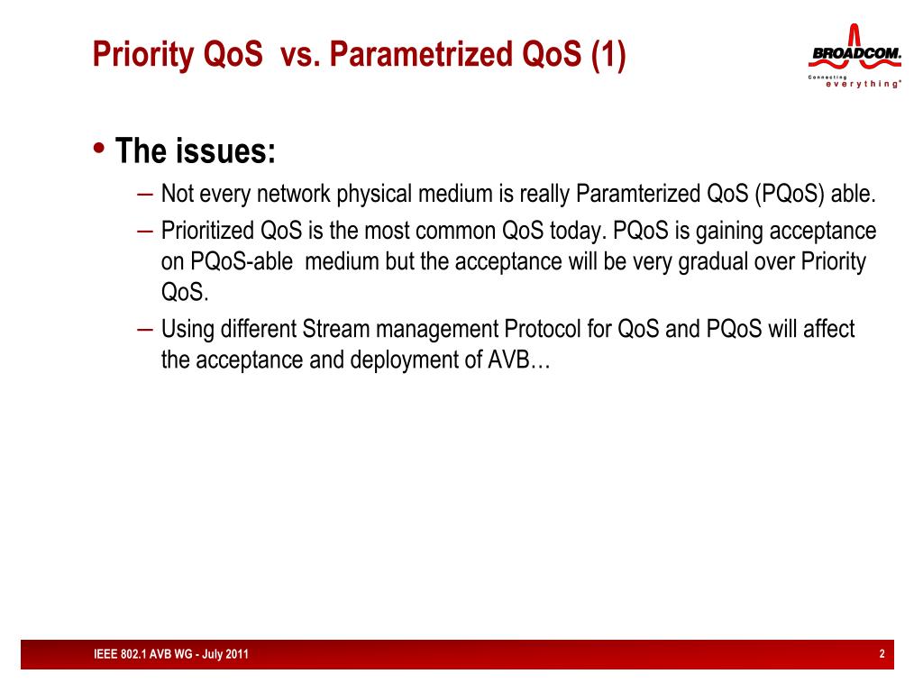 Priority QoS vs. ParametrizedQoS (1) IEEE 802.1 AVB WG - July 2011 • The issues: • Not every network physical medium is really ParamterizedQoS (PQoS) able. • Prioritized QoS is the most common QoS today. PQoS is gaining acceptance on PQoS-able medium but the acceptance will be very gradual over Priority QoS. • Using different Stream management Protocol for QoS and PQoS will affect the acceptance and deployment of AVB…
