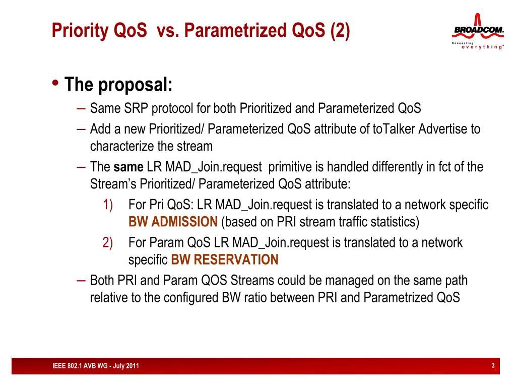 Priority QoS vs. ParametrizedQoS (2) IEEE 802.1 AVB WG - July 2011 • The proposal: • Same SRP protocol for both Prioritized and Parameterized QoS • Add a new Prioritized/ Parameterized QoS attribute of toTalkerAdvertise to characterize the stream • The same LR MAD_Join.request primitive is handled differently in fct of the Stream’s Prioritized/ Parameterized QoS attribute: • For PriQoS: LR MAD_Join.request is translated to a network specific BW ADMISSION (based on PRI stream traffic statistics) • For ParamQoS LR MAD_Join.request is translated to a network specific BW RESERVATION • Both PRI and Param QOS Streams could be managed on the same path relative to the configured BW ratio between PRI and ParametrizedQoS