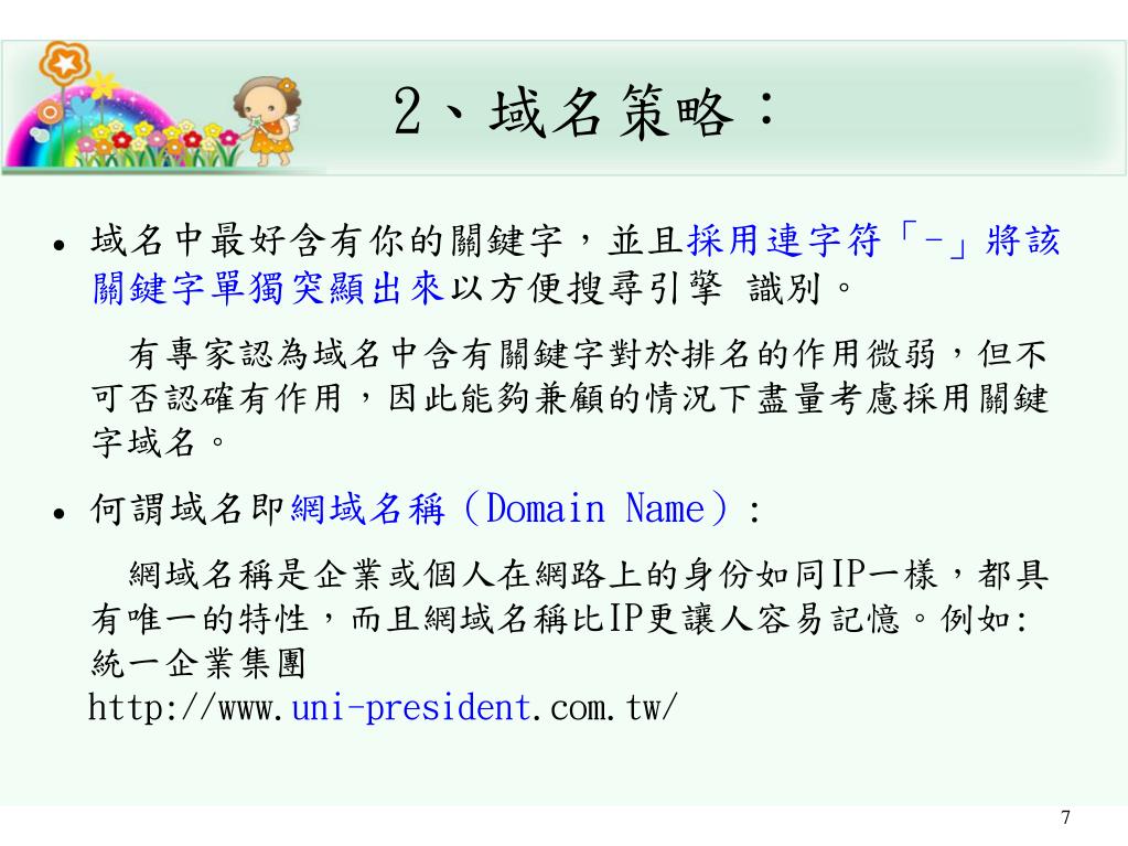 2、域名策略: • 域名中最好含有你的關鍵字,並且採用連字符「-」將該關鍵字單獨突顯出來以方便搜尋引擎 識別。 有專家認為域名中含有關鍵字對於排名的作用微弱,但不可否認確有作用,因此能夠兼顧的情況下盡量考慮採用關鍵字域名。 • 何謂域名即網域名稱(Domain Name): 網域名稱是企業或個人在網路上的身份如同IP一樣,都具有唯一的特性,而且網域名稱比IP更讓人容易記憶。例如:統一企業集團 http://www.uni-president.com.tw/