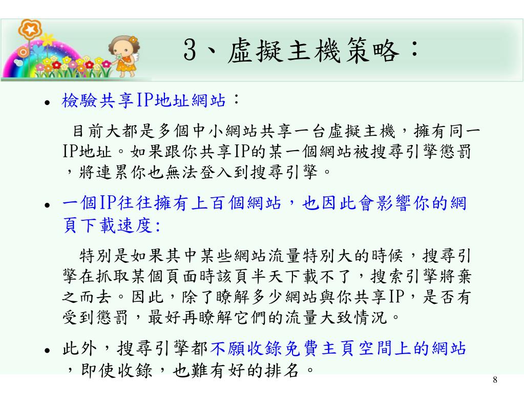 3、虛擬主機策略: • 檢驗共享IP地址網站: 目前大都是多個中小網站共享一台虛擬主機,擁有同一IP地址。如果跟你共享IP的某一個網站被搜尋引擎懲罰,將連累你也無法登入到搜尋引擎。 • 一個IP往往擁有上百個網站,也因此會影響你的網頁下載速度: 特別是如果其中某些網站流量特別大的時候,搜尋引擎在抓取某個頁面時該頁半天下載不了,搜索引擎將棄之而去。因此,除了瞭解多少網站與你共享IP,是否有受到懲罰,最好再瞭解它們的流量大致情況。 • 此外,搜尋引擎都不願收錄免費主頁空間上的網站,即使收錄,也難有好的排名。
