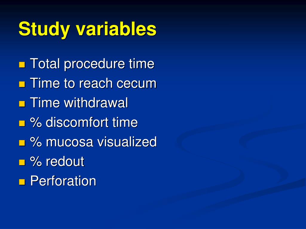 Study variables Total procedure time Time to reach cecum Time withdrawal % discomfort time % mucosa visualized % redout Perforation