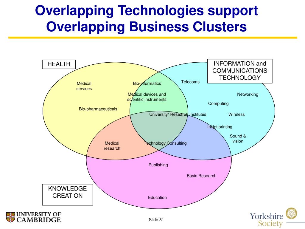 Overlapping Technologies support Overlapping Business Clusters INFORMATION and COMMUNICATIONS TECHNOLOGY HEALTH Telecoms Medicalservices Bio-informatics Medical devices and scientific instruments Networking Computing Bio-pharmaceuticals University/ Research Institutes Wireless Inkjet printing Sound & vision Medicalresearch Technology Consulting Publishing Basic Research KNOWLEDGE CREATION Education