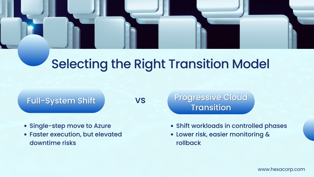 6. SelectingtheRightTransitionModel Selecting the Right Transition Model Progressive Cloud Progressive Cloud Transition Transition vs Full-System Shift Full-System Shift Single-step move to Azure Faster execution, but elevated downtime risks Shift workloads in controlled phases Lower risk, easier monitoring & rollback www.hexacorp.com