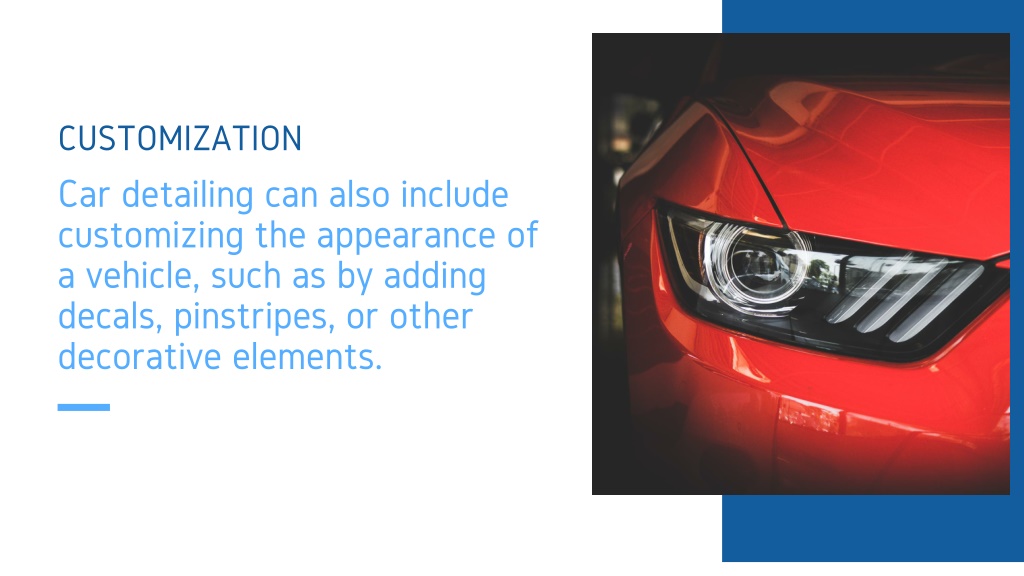 CUSTOMIZATION Car detailing can also include customizing the appearance of a vehicle, such as by adding decals, pinstripes, or other decorative elements.