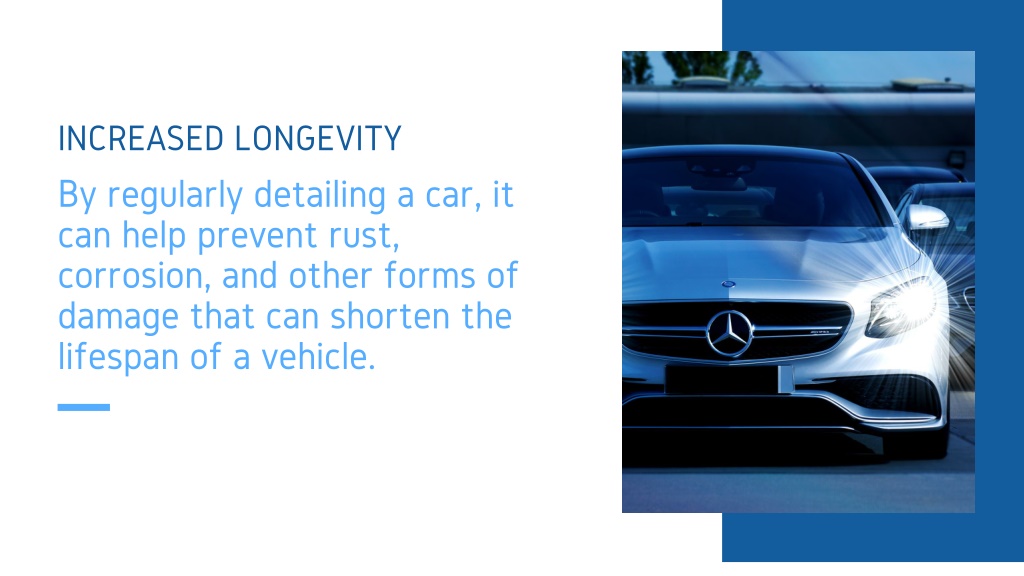 INCREASED LONGEVITY By regularly detailing a car, it can help prevent rust, corrosion, and other forms of damage that can shorten the lifespan of a vehicle.
