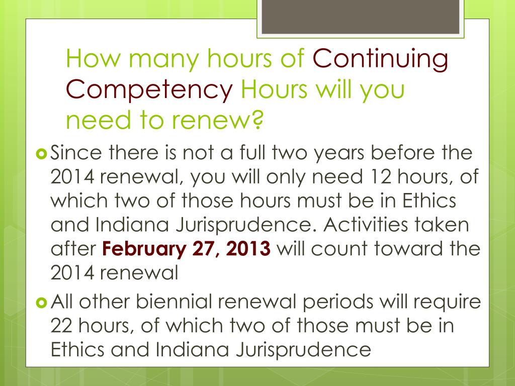 How many hours of ContinuingCompetency Hours will you need to renew? • Since there is not a full two years before the 2014 renewal, you will only need 12 hours, of which two of those hours must be in Ethics and Indiana Jurisprudence. Activities taken after February 27, 2013 will count toward the 2014 renewal • All other biennial renewal periods will require 22 hours, of which two of those must be in Ethics and Indiana Jurisprudence