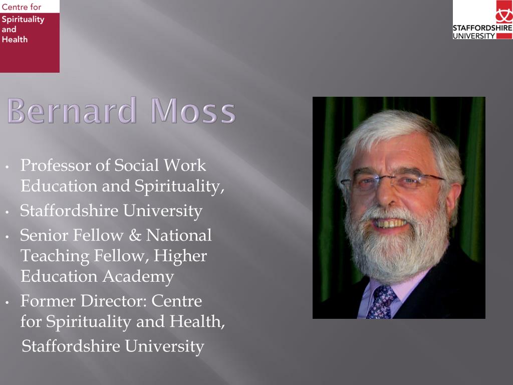 Bernard Moss • Professor of Social Work Education and Spirituality, • Staffordshire University • Senior Fellow & National Teaching Fellow, Higher Education Academy • Former Director: Centre for Spirituality and Health, Staffordshire University