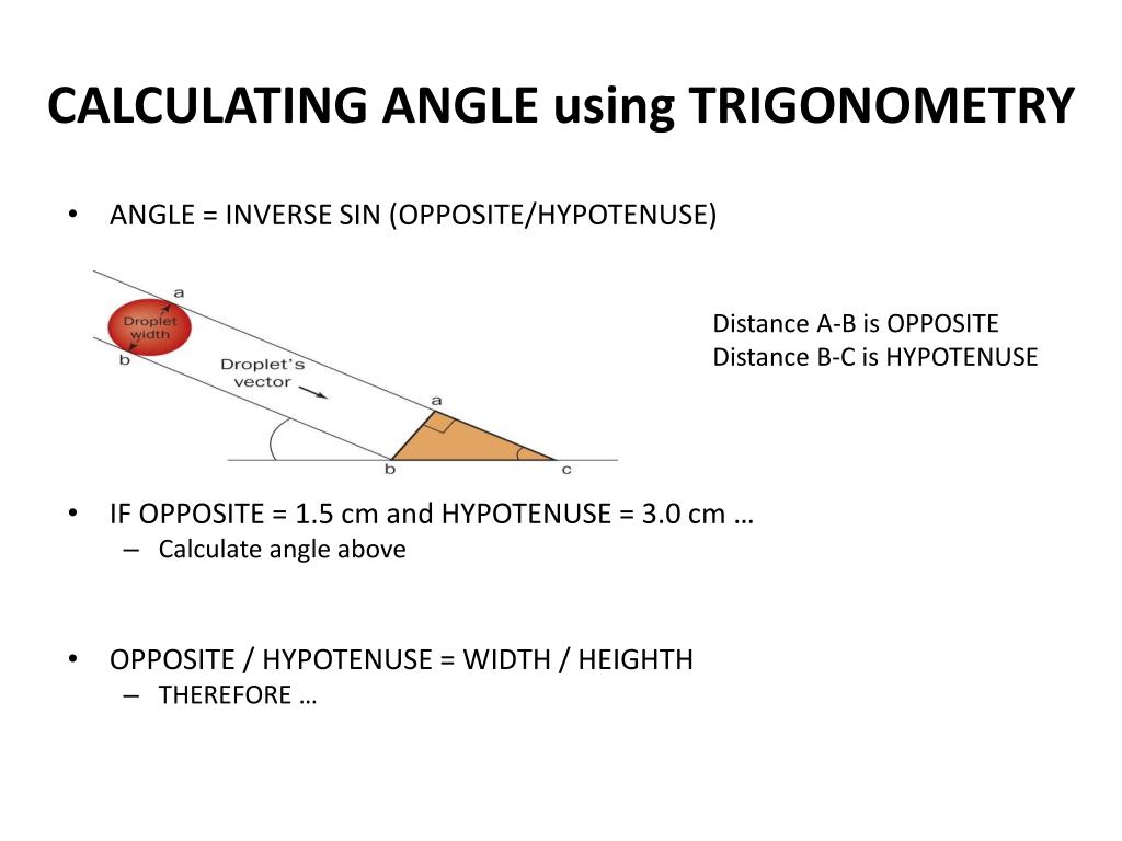 CALCULATING ANGLE using TRIGONOMETRY • ANGLE = INVERSE SIN (OPPOSITE/HYPOTENUSE) • IF OPPOSITE = 1.5 cm and HYPOTENUSE = 3.0 cm … • Calculate angle above • OPPOSITE / HYPOTENUSE = WIDTH / HEIGHTH • THEREFORE … Distance A-B is OPPOSITE Distance B-C is HYPOTENUSE