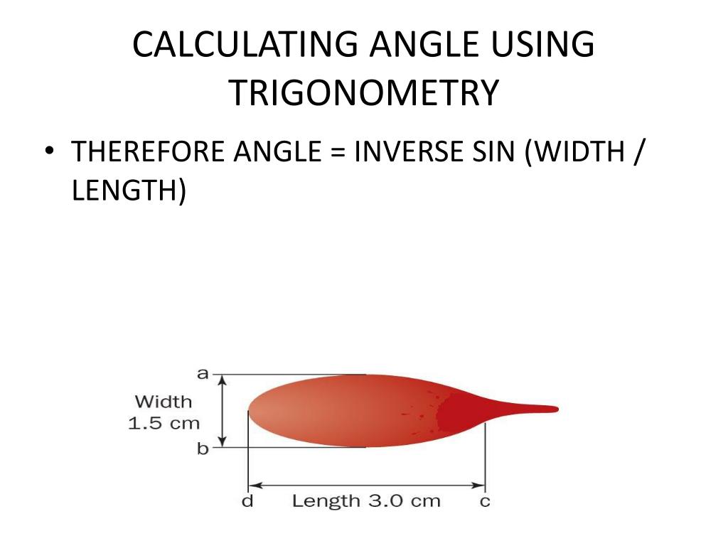 CALCULATING ANGLE USING TRIGONOMETRY • THEREFORE ANGLE = INVERSE SIN (WIDTH / LENGTH)