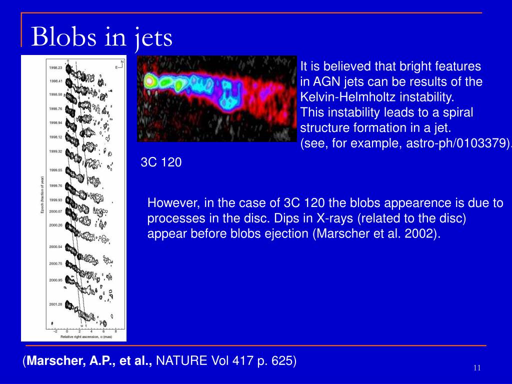 Blobs in jets It is believed that bright featuresin AGN jets can be results of theKelvin-Helmholtz instability.This instability leads to a spiralstructure formation in a jet. (see, for example,astro-ph/0103379). 3C 120 However, in the case of 3C 120 the blobs appearence is due toprocesses in the disc. Dips in X-rays (related to the disc) appear before blobs ejection (Marscher et al. 2002). (Marscher, A.P., et al., NATURE Vol 417 p. 625)