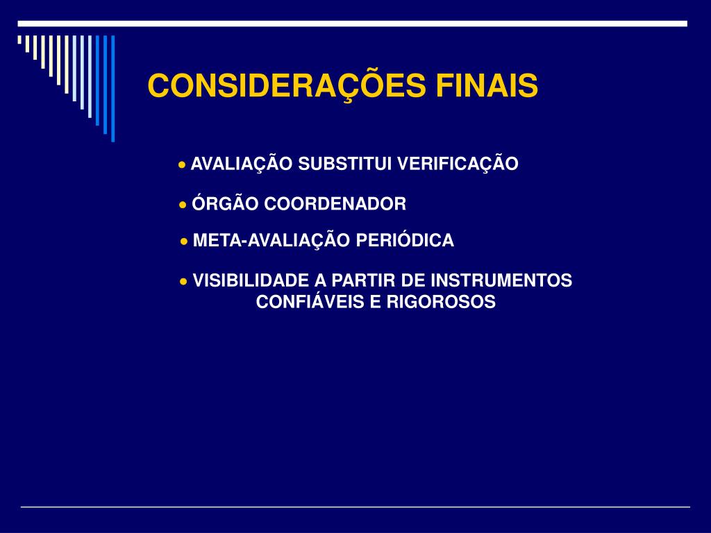 CONSIDERAÇÕES FINAIS AVALIAÇÃO SUBSTITUI VERIFICAÇÃO ÓRGÃO COORDENADOR META-AVALIAÇÃO PERIÓDICA VISIBILIDADE A PARTIR DE INSTRUMENTOS CONFIÁVEIS E RIGOROSOS