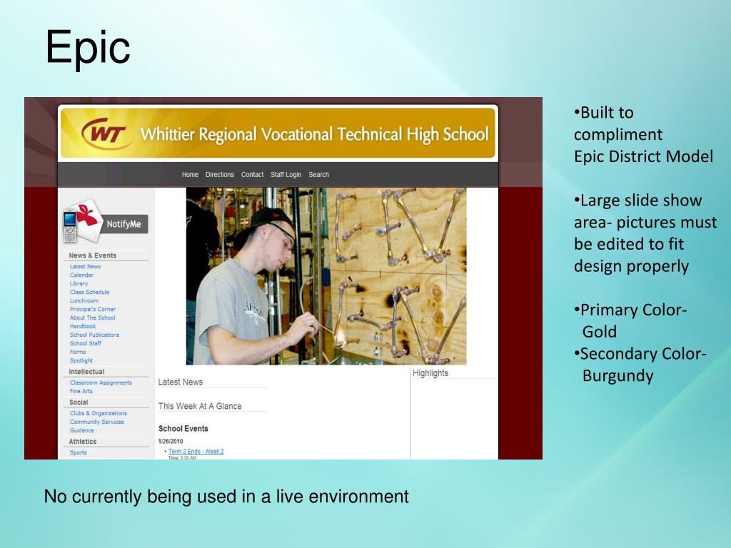 Epic • Built to complimentEpic District Model • Large slide show area- pictures must be edited to fit design properly • Primary Color- • Gold • Secondary Color- • Burgundy No currently being used in a live environment
