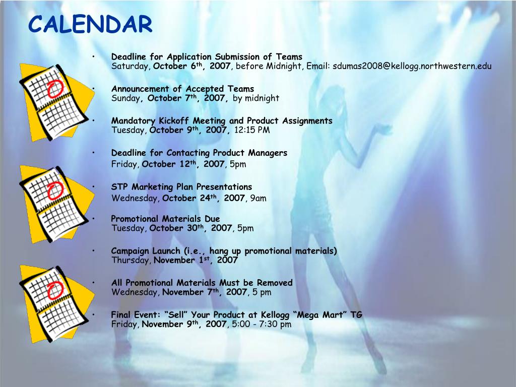 CALENDAR • Deadline for Application Submission of TeamsSaturday, October 6th, 2007, before Midnight, Email: sdumas2008@kellogg.northwestern.edu • Announcement of Accepted Teams Sunday, October 7th, 2007, by midnight • Mandatory Kickoff Meeting and Product AssignmentsTuesday, October 9th, 2007, 12:15 PM • Deadline for Contacting Product Managers Friday, October 12th, 2007, 5pm • STP Marketing Plan Presentations Wednesday, October 24th, 2007, 9am • Promotional Materials DueTuesday, October 30th, 2007, 5pm • Campaign Launch (i.e., hang up promotional materials)Thursday, November 1st, 2007 • All Promotional Materials Must be RemovedWednesday, November 7th, 2007, 5 pm • Final Event: “Sell” Your Product at Kellogg “Mega Mart” TGFriday, November 9th, 2007, 5:00 - 7:30 pm