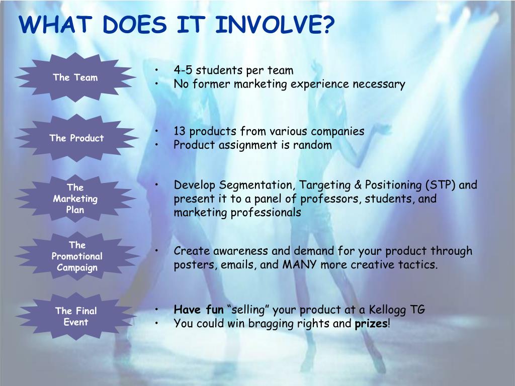 WHAT DOES IT INVOLVE? The Team • 4-5 students per team • No former marketing experience necessary The Product • 13 products from various companies • Product assignment is random The Marketing Plan • Develop Segmentation, Targeting & Positioning (STP) and present it to a panel of professors, students, and marketing professionals The Promotional Campaign • Create awareness and demand for your product through posters, emails, and MANY more creative tactics. The Final Event • Have fun “selling” your product at a Kellogg TG • You could win bragging rights and prizes!