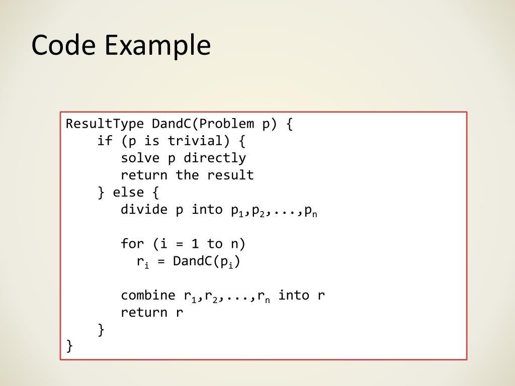 Code Example ResultTypeDandC(Problem p) { if (p is trivial) { solve p directly return the result } else { divide p into p1,p2,...,pn for (i = 1 to n) ri = DandC(pi) combine r1,r2,...,rn into r return r } }