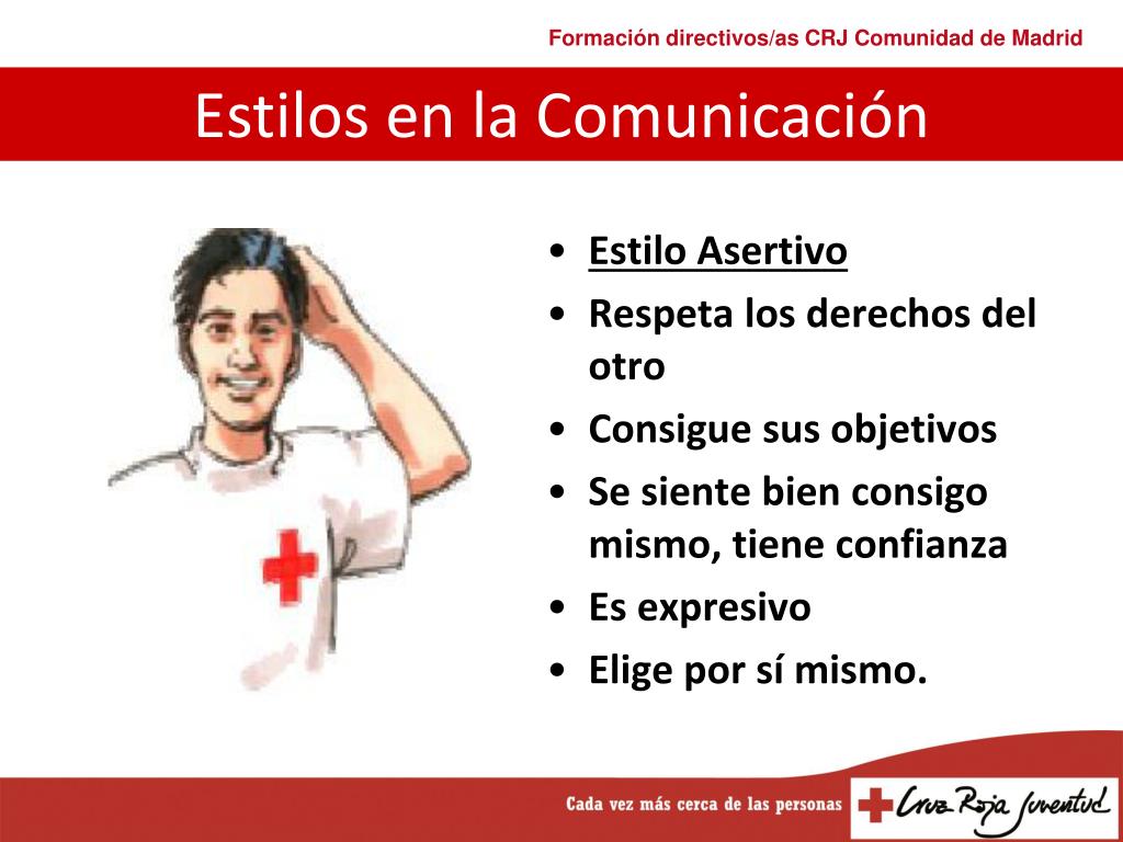 Estilos en la Comunicación • Estilo Asertivo • Respeta los derechos del otro • Consigue sus objetivos • Se siente bien consigo mismo, tiene confianza • Es expresivo • Elige por sí mismo.