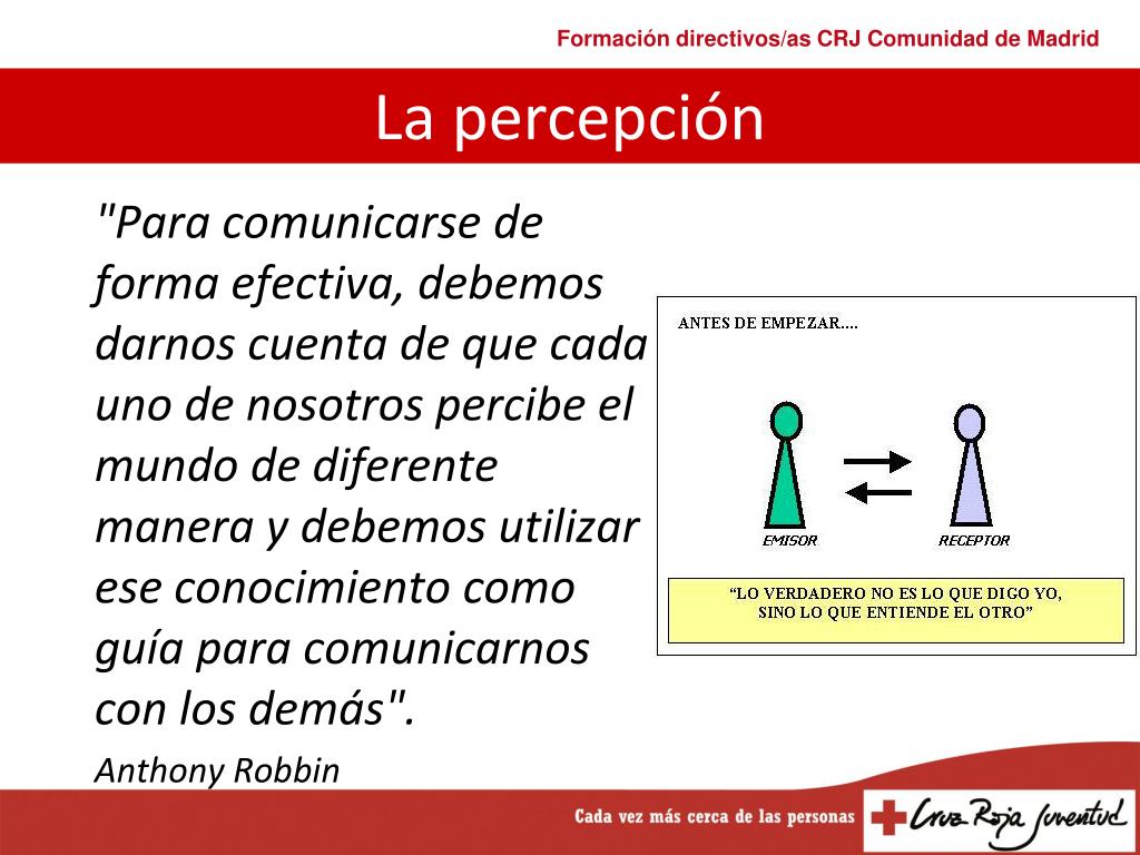 "Para comunicarse de forma efectiva, debemos darnos cuenta de que cada uno de nosotros percibe el mundo de diferente manera y debemos utilizar ese conocimiento como guía para comunicarnos con los demás". Anthony Robbin La percepción