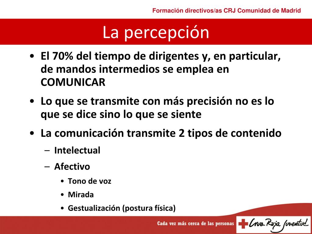 El 70% del tiempo de dirigentes y, en particular, de mandos intermedios se emplea en COMUNICAR Lo que se transmite con más precisión no es lo que se dice sino lo que se siente La comunicación transmite 2 tipos de contenido Intelectual Afectivo Tono de voz Mirada Gestualización (postura física) La percepción