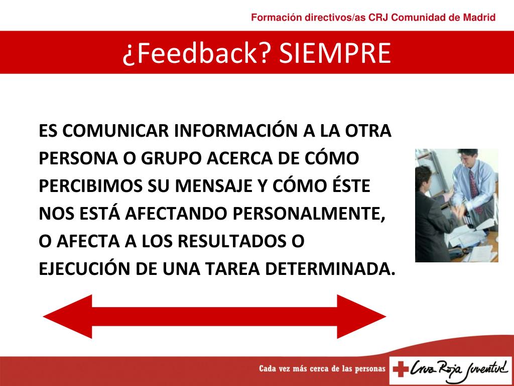 ES COMUNICAR INFORMACIÓN A LA OTRA PERSONA O GRUPO ACERCA DE CÓMO PERCIBIMOS SU MENSAJE Y CÓMO ÉSTE NOS ESTÁ AFECTANDO PERSONALMENTE, O AFECTA A LOS RESULTADOS O EJECUCIÓN DE UNA TAREA DETERMINADA. ¿Feedback? SIEMPRE