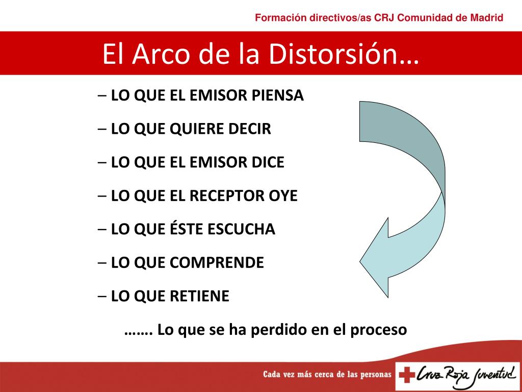 LO QUE EL EMISOR PIENSA LO QUE QUIERE DECIR LO QUE EL EMISOR DICE LO QUE EL RECEPTOR OYE LO QUE ÉSTE ESCUCHA LO QUE COMPRENDE LO QUE RETIENE ……. Lo que se ha perdido en el proceso El Arco de la Distorsión…