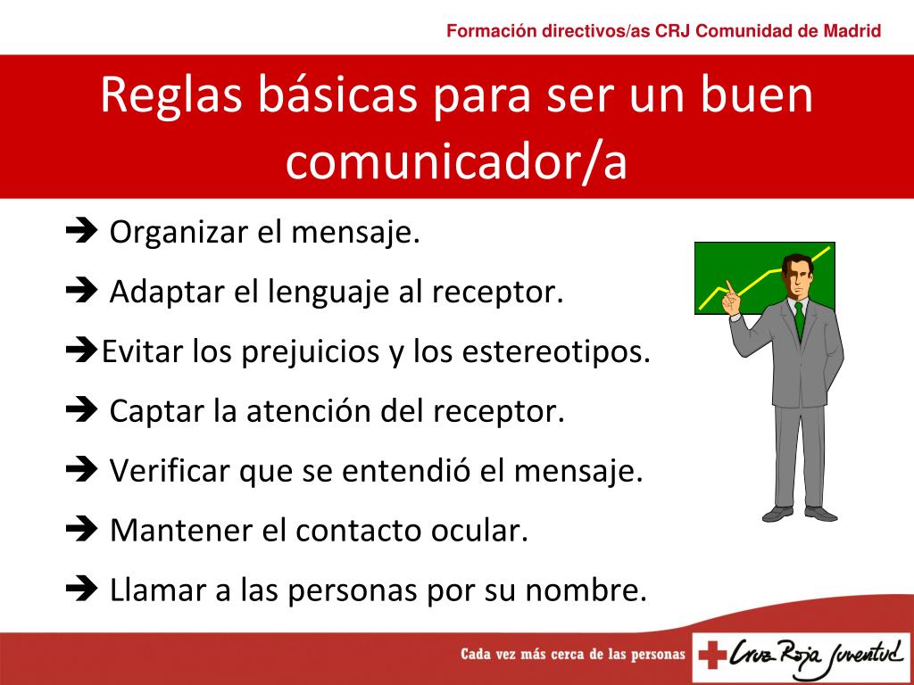 Organizar el mensaje. Adaptar el lenguaje al receptor. Evitar los prejuicios y los estereotipos. Captar la atención del receptor. Verificar que se entendió el mensaje. Mantener el contacto ocular. Llamar a las personas por su nombre. Reglas básicas para ser un buen comunicador/a