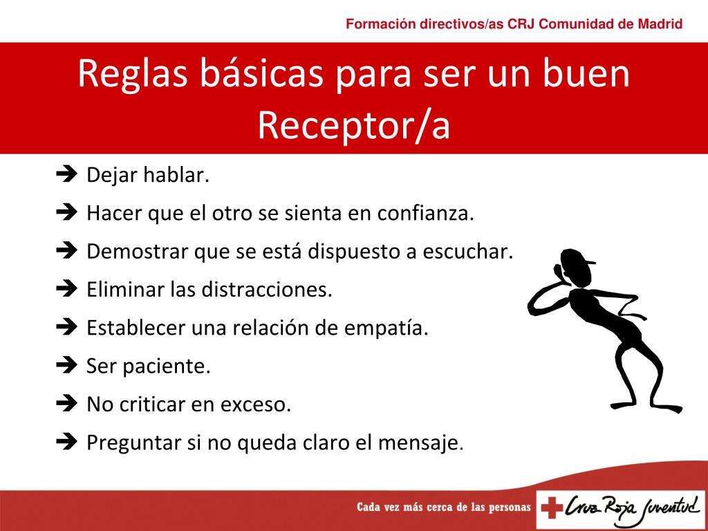 Dejar hablar. Hacer que el otro se sienta en confianza. Demostrar que se está dispuesto a escuchar. Eliminar las distracciones. Establecer una relación de empatía. Ser paciente. No criticar en exceso. Preguntar si no queda claro el mensaje. Reglas básicas para ser un buen Receptor/a