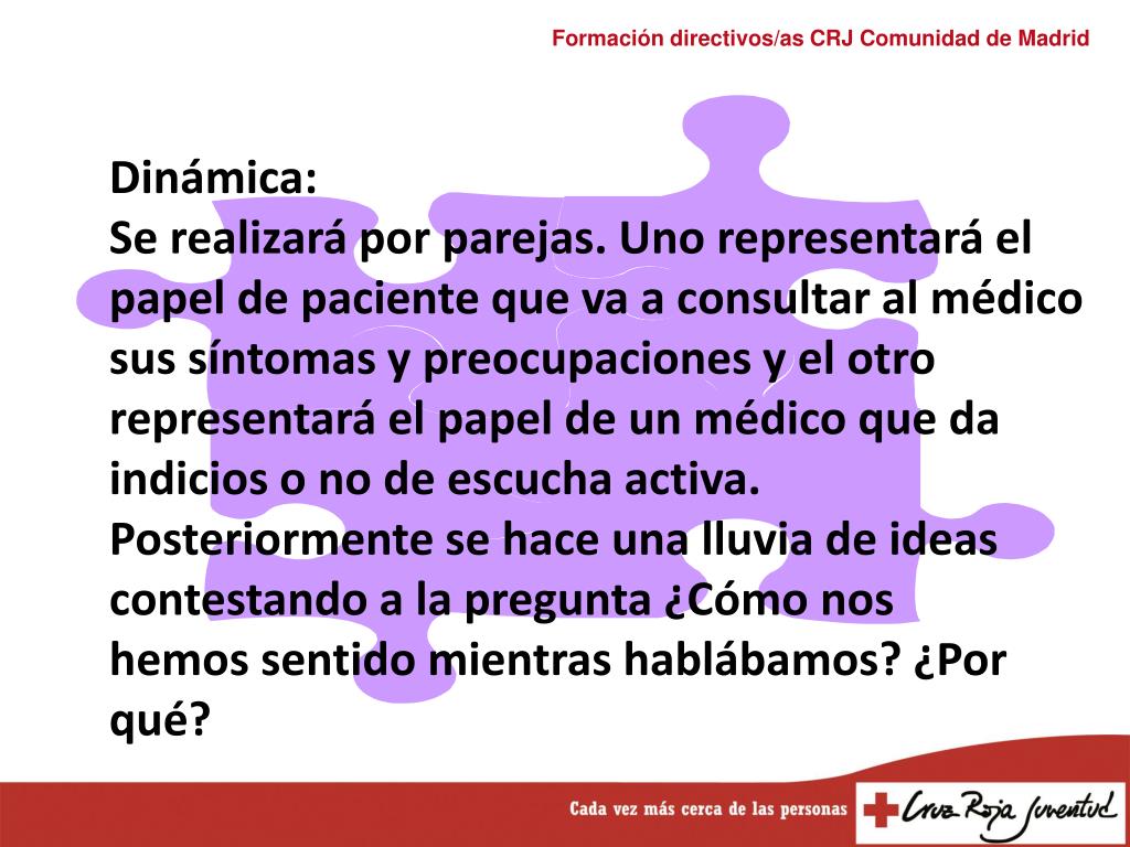 Dinámica: Se realizará por parejas. Uno representará el papel de paciente que va a consultar al médico sus síntomas y preocupaciones y el otro representará el papel de un médico que da indicios o no de escucha activa. Posteriormente se hace una lluvia de ideas contestando a la pregunta ¿Cómo nos hemos sentido mientras hablábamos? ¿Por qué?