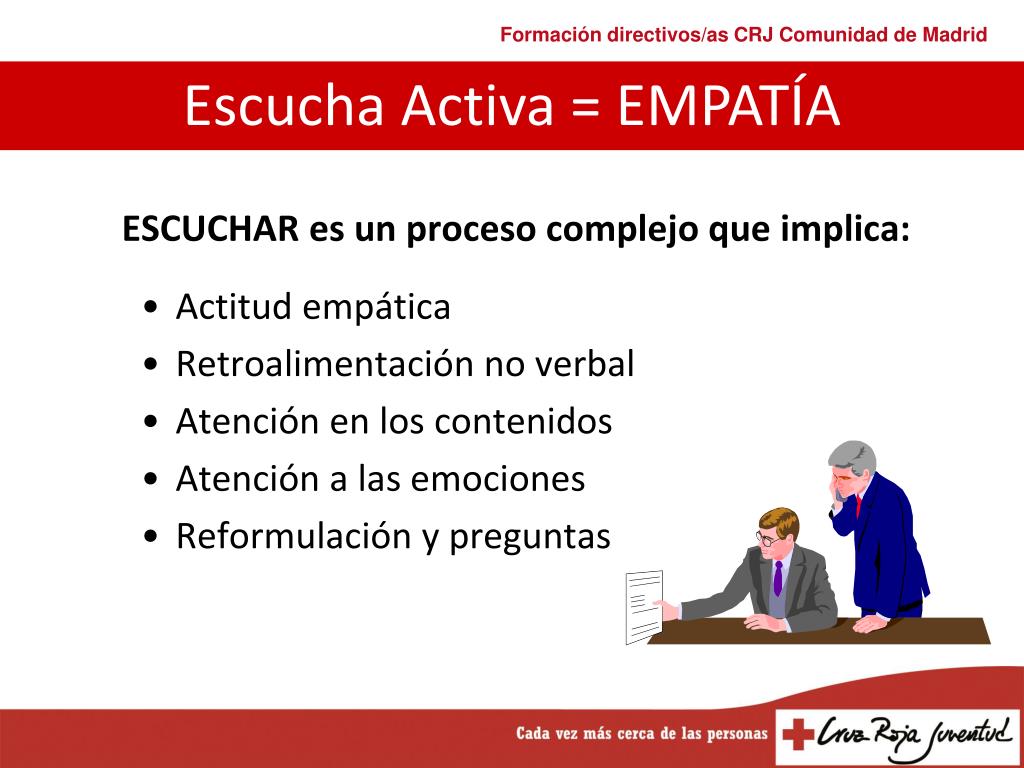 Escucha Activa = EMPATÍA LA EMPATIA IMPLICA: ESCUCHAR Y COMPRENDER LAS EXPERIENCIAS Y SENTIMIENTOS DE OTRA PERSONA, TRATANDO DE ENTRAR EN SU MARCO DE REFERENCIA, RESPETANDO SU FORMA DE PENSAR O SENTIR.