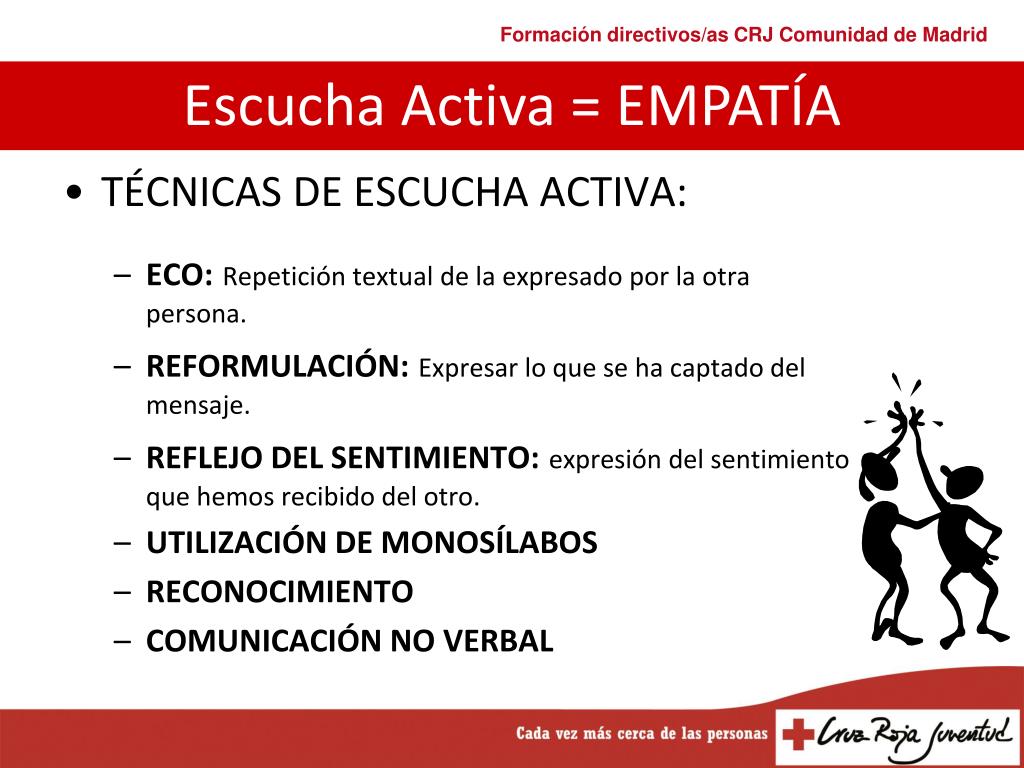 TÉCNICAS DE ESCUCHA ACTIVA: ECO:Repetición textual de la expresado por la otra persona. REFORMULACIÓN:Expresar lo que se ha captado del mensaje. REFLEJO DEL SENTIMIENTO:expresión del sentimiento que hemos recibido del otro. UTILIZACIÓN DE MONOSÍLABOS RECONOCIMIENTO COMUNICACIÓN NO VERBAL Escucha Activa = EMPATÍA