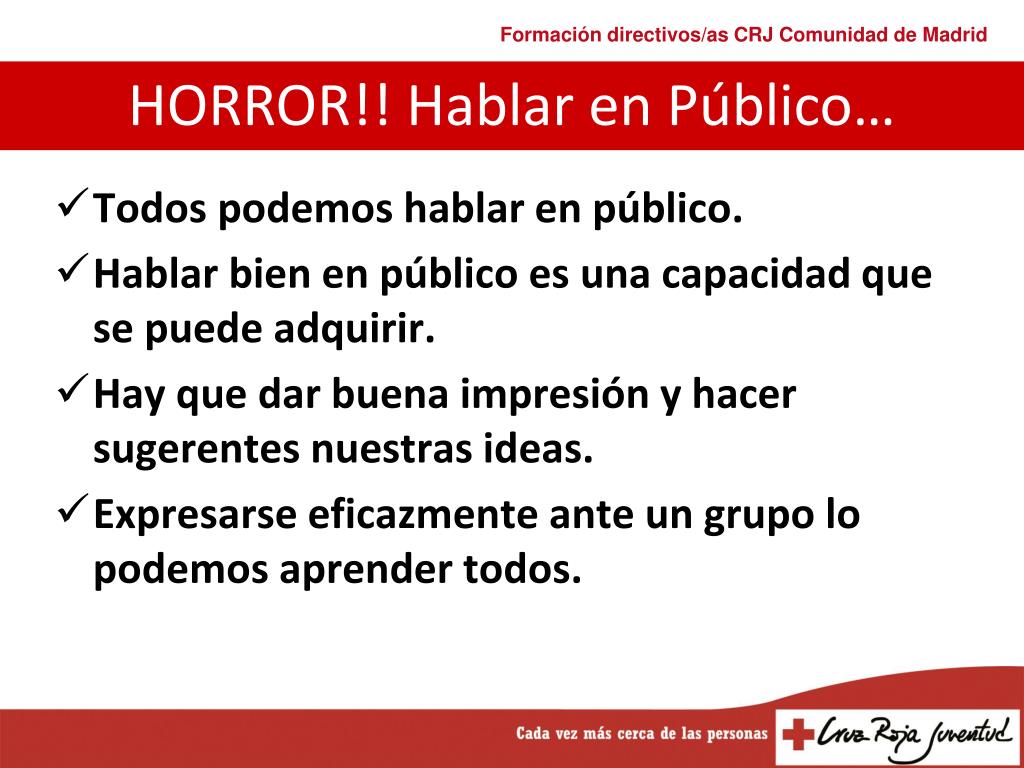 Todos podemos hablar en público. Hablar bien en público es una capacidad que se puede adquirir. Hay que dar buena impresión y hacer sugerentes nuestras ideas. Expresarse eficazmente ante un grupo lo podemos aprender todos. HORROR!! Hablar en Público…