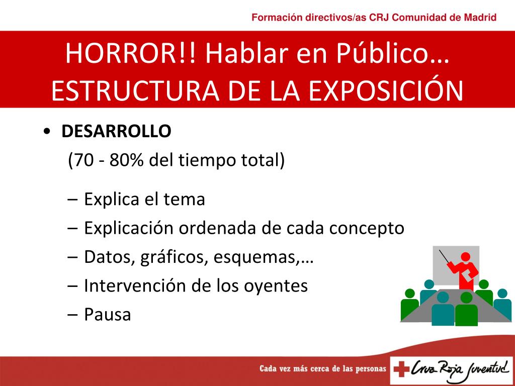 DESARROLLO (70 - 80% del tiempo total) Explica el tema Explicación ordenada de cada concepto Datos, gráficos, esquemas,… Intervención de los oyentes Pausa HORROR!! Hablar en Público…ESTRUCTURA DE LA EXPOSICIÓN