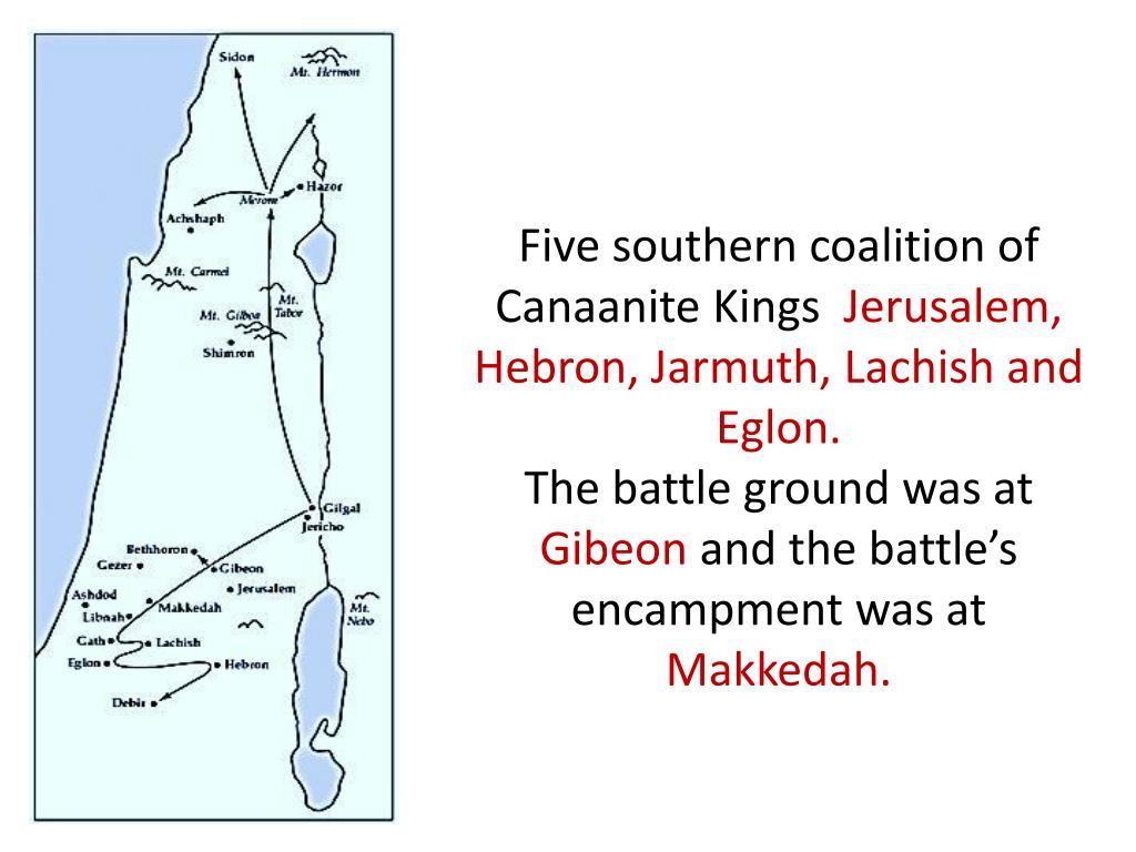 God Fights for His Children. Joshua 10:1-27 . Five southern coalition of Canaanite Kings Jerusalem, Hebron, Jarmuth , Lachish and Eglon . The battle ground was at Gibeon and the battle’s encampment was at Makkedah . Joshua (10:1-5).