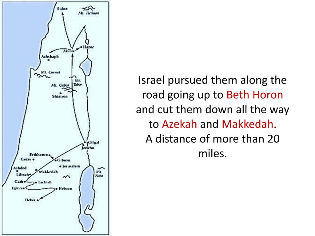 Israel pursued them along the road going up to Beth Horonand cut them down all the way to Azekah and Makkedah. A distance of more than 20 miles.