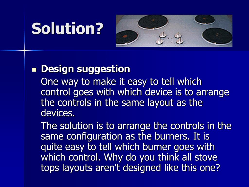 Solution? • Design suggestion One way to make it easy to tell which control goes with which device is to arrange the controls in the same layout as the devices. The solution is to arrange the controls in the same configuration as the burners. It is quite easy to tell which burner goes with which control. Why do you think all stove tops layouts aren't designed like this one?