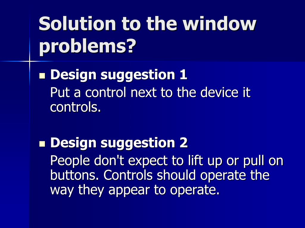 Solution to the window problems? • Design suggestion 1 Put a control next to the device it controls. • Design suggestion 2 People don't expect to lift up or pull on buttons. Controls should operate the way they appear to operate.
