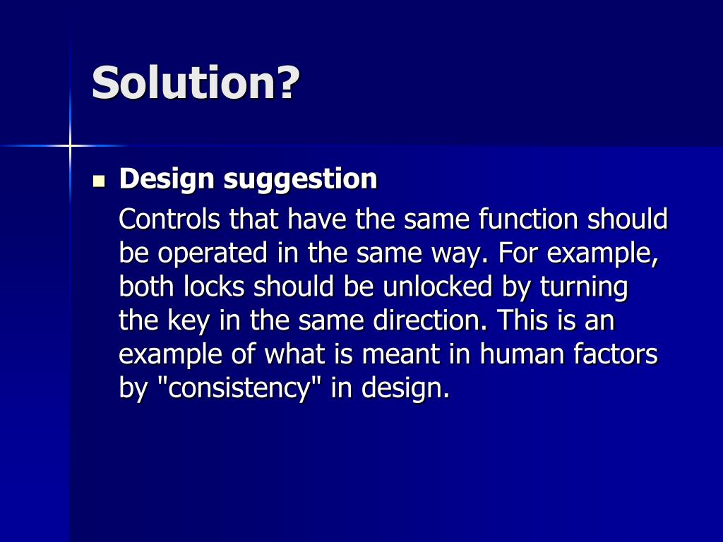 Solution? • Design suggestion Controls that have the same function should be operated in the same way. For example, both locks should be unlocked by turning the key in the same direction. This is an example of what is meant in human factors by "consistency" in design.