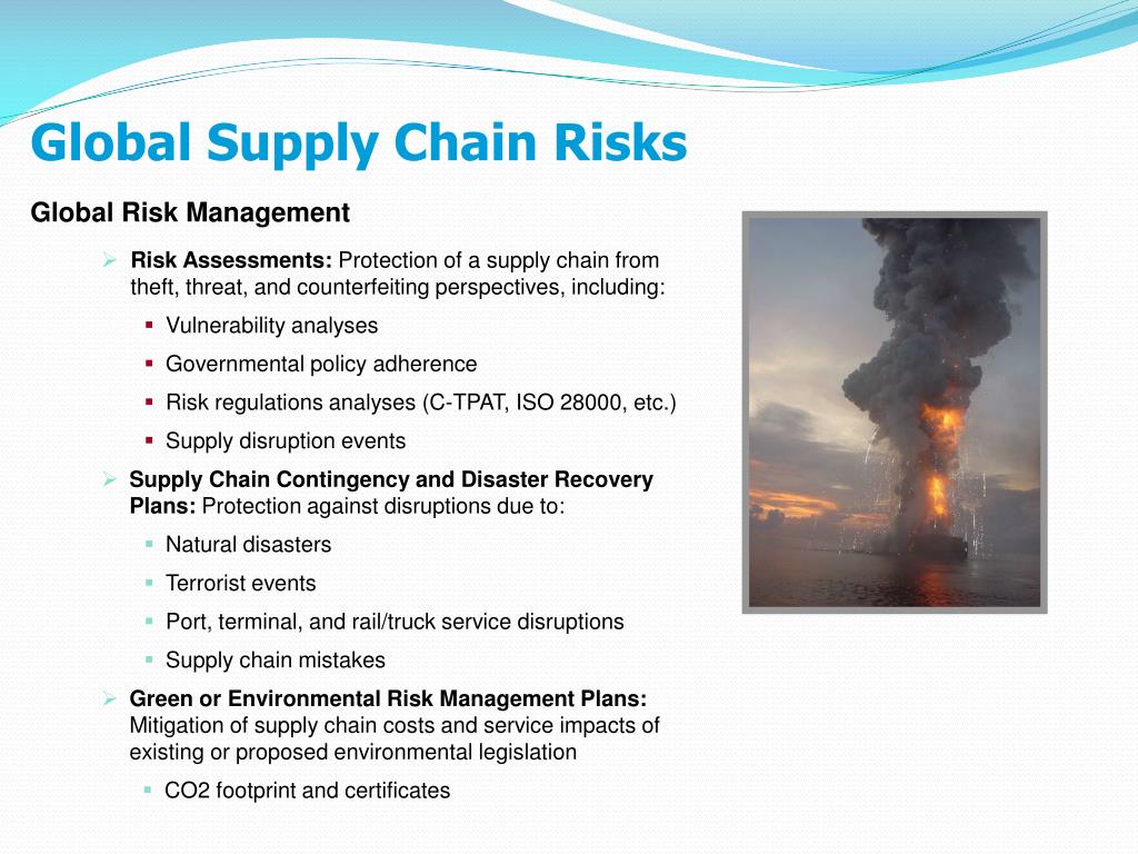 Global Supply Chain Risks • Global Risk Management • Risk Assessments: Protection of a supply chain from theft, threat, and counterfeiting perspectives, including: • Vulnerability analyses • Governmental policy adherence • Risk regulations analyses (C-TPAT, ISO 28000, etc.) • Supply disruption events • Supply Chain Contingency and Disaster Recovery Plans: Protection against disruptions due to: • Natural disasters • Terrorist events • Port, terminal, and rail/truck service disruptions • Supply chain mistakes • Green or Environmental Risk Management Plans: Mitigation of supply chain costs and service impacts of existing or proposed environmental legislation • CO2 footprint and certificates