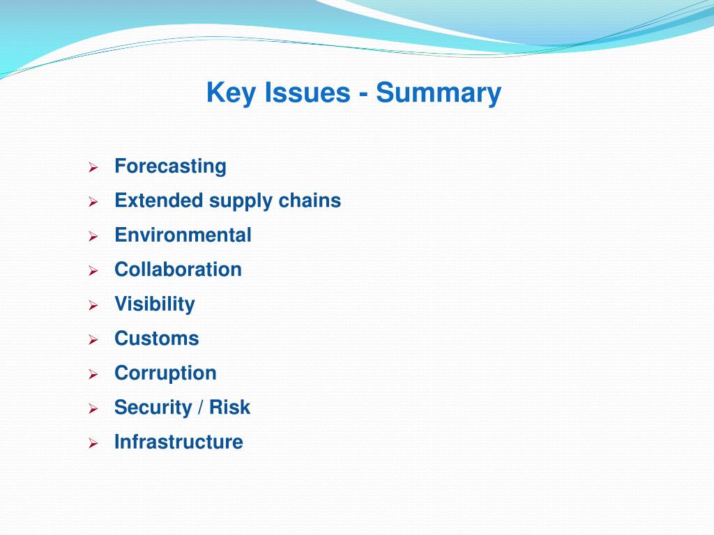 Key Issues - Summary • Forecasting • Extended supply chains • Environmental • Collaboration • Visibility • Customs • Corruption • Security / Risk • Infrastructure