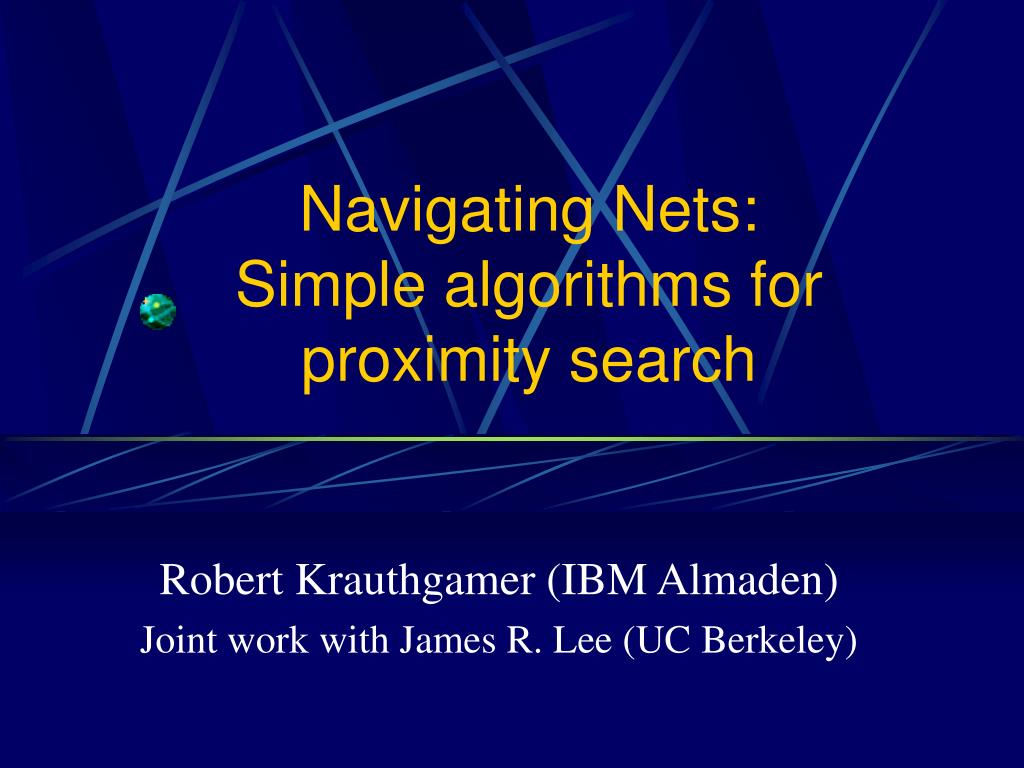 Navigating Nets: Simple algorithms for proximity search Robert Krauthgamer (IBM Almaden) Joint work with James R. Lee (UC Berkeley)